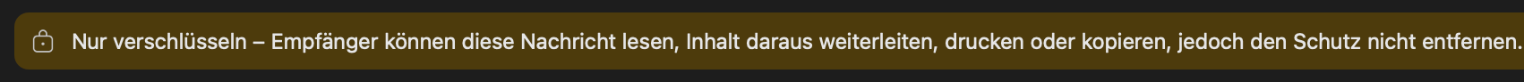 Nachdem ich meine Mail geschrieben habe, wähle ich in Outlook Entwurf -> Verschlüsseln -> Nur verschlüsseln aus. Am oberen Rand meiner Mail erscheint daraufhin folgender Hinweis: