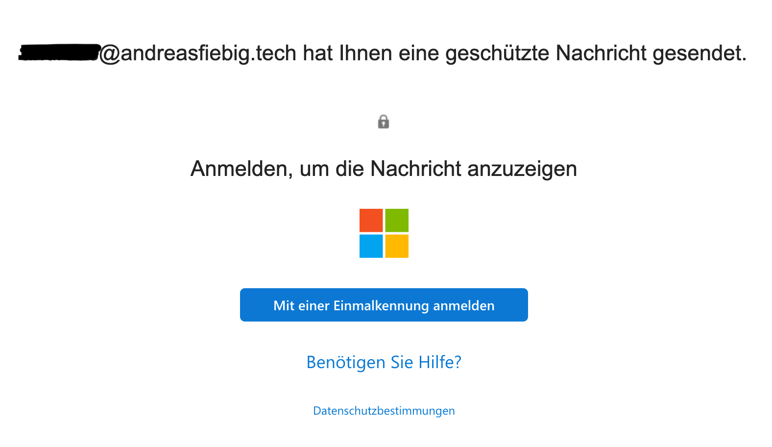 Nach dem Versand der Nachricht kommt in meiner externen Testmailbox eine Mail mit der Information an, dass mir eine verschlüsselte Nachricht gesendet wurde und ich diese über „Nachricht lesen“ anschauen kann. Über den Link lande ich auf einer Microsoft-Webseite.