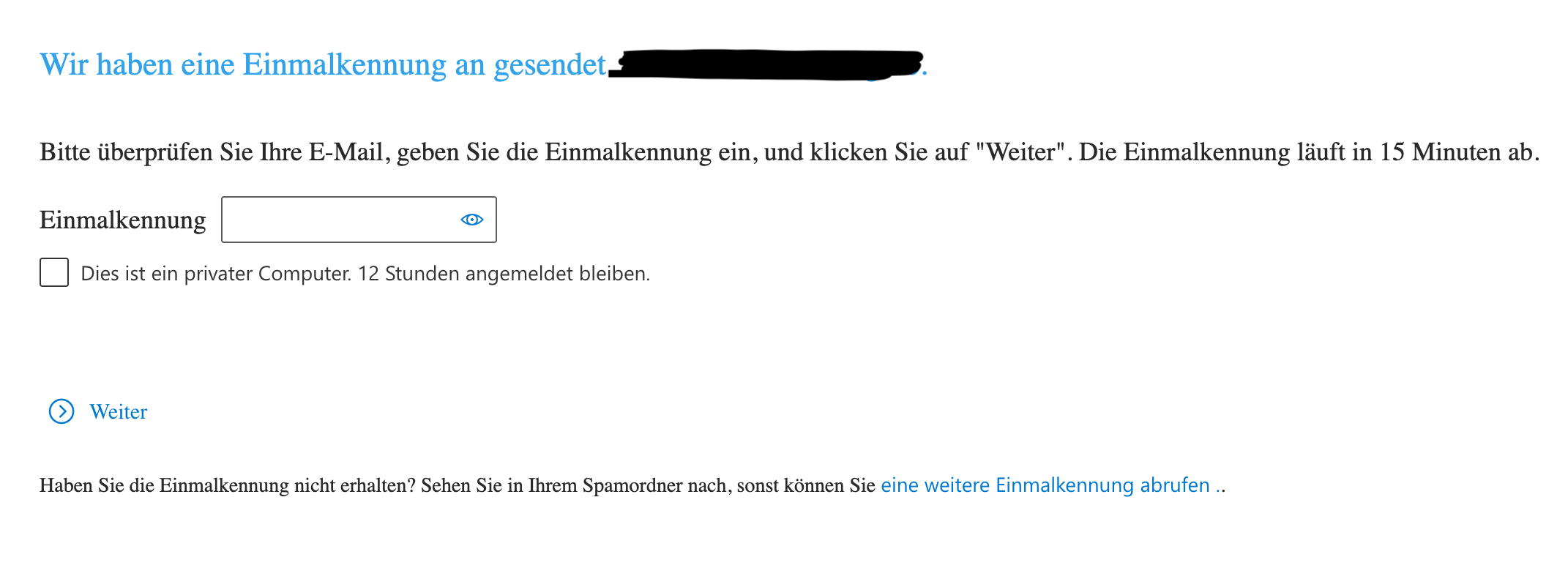 Nach dem Klick auf „Mit einer Einmalkennung anmelden“ bekomme ich eine weitere Mail mit einem Einmalkennwort zugeschickt.